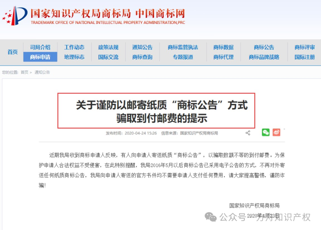 商标通过审查进入初审公告后,一些不良代理公司冒充商标局寄一份《商标初审公告通知书》的到付费邮件给商标注册人,以快递公司代收邮费的形式骗钱。
